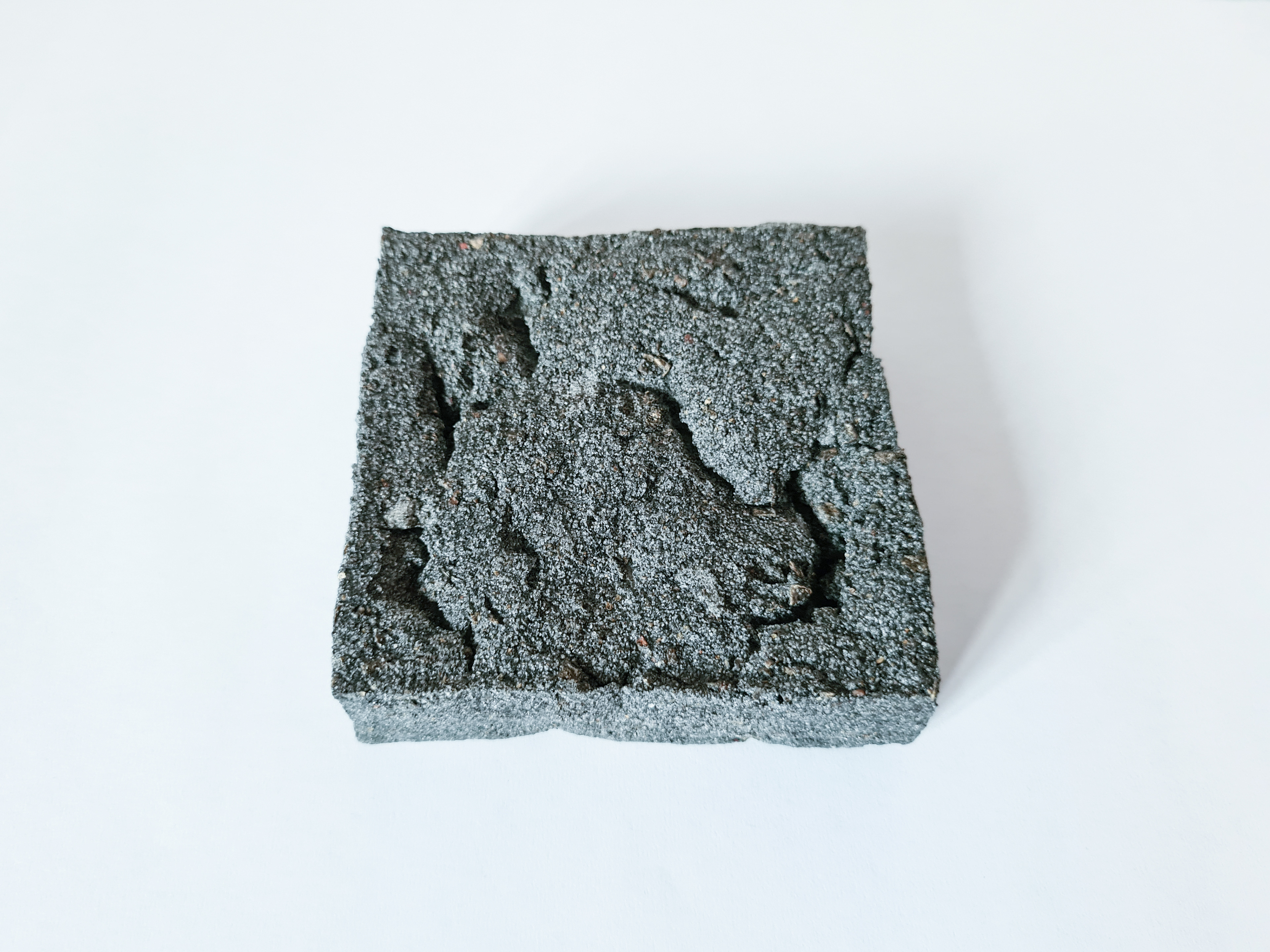 Because the material shrunk during the drying process, cracks have formed. In combination with the black look due to the charcoal, this provides a unique aesthetic.