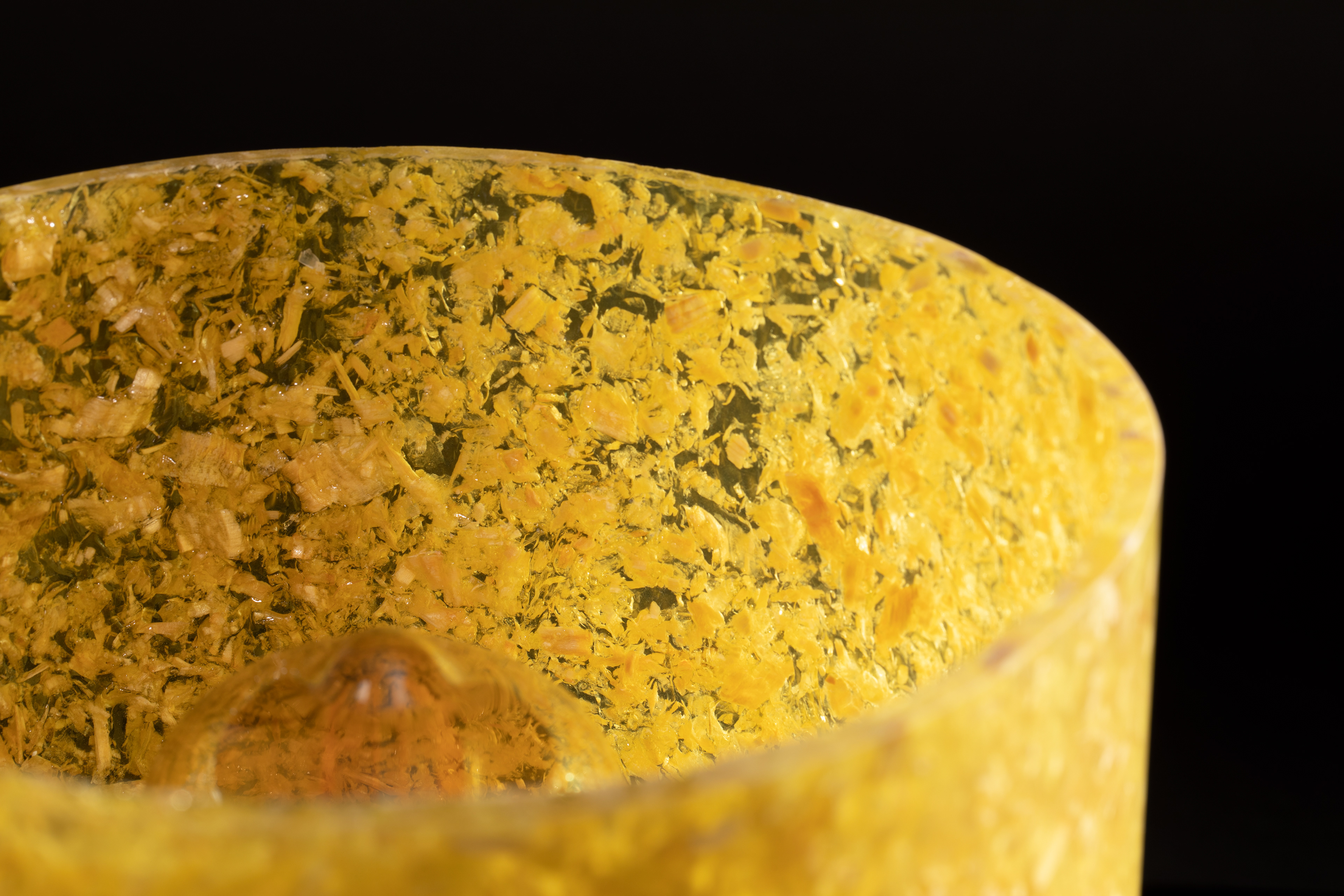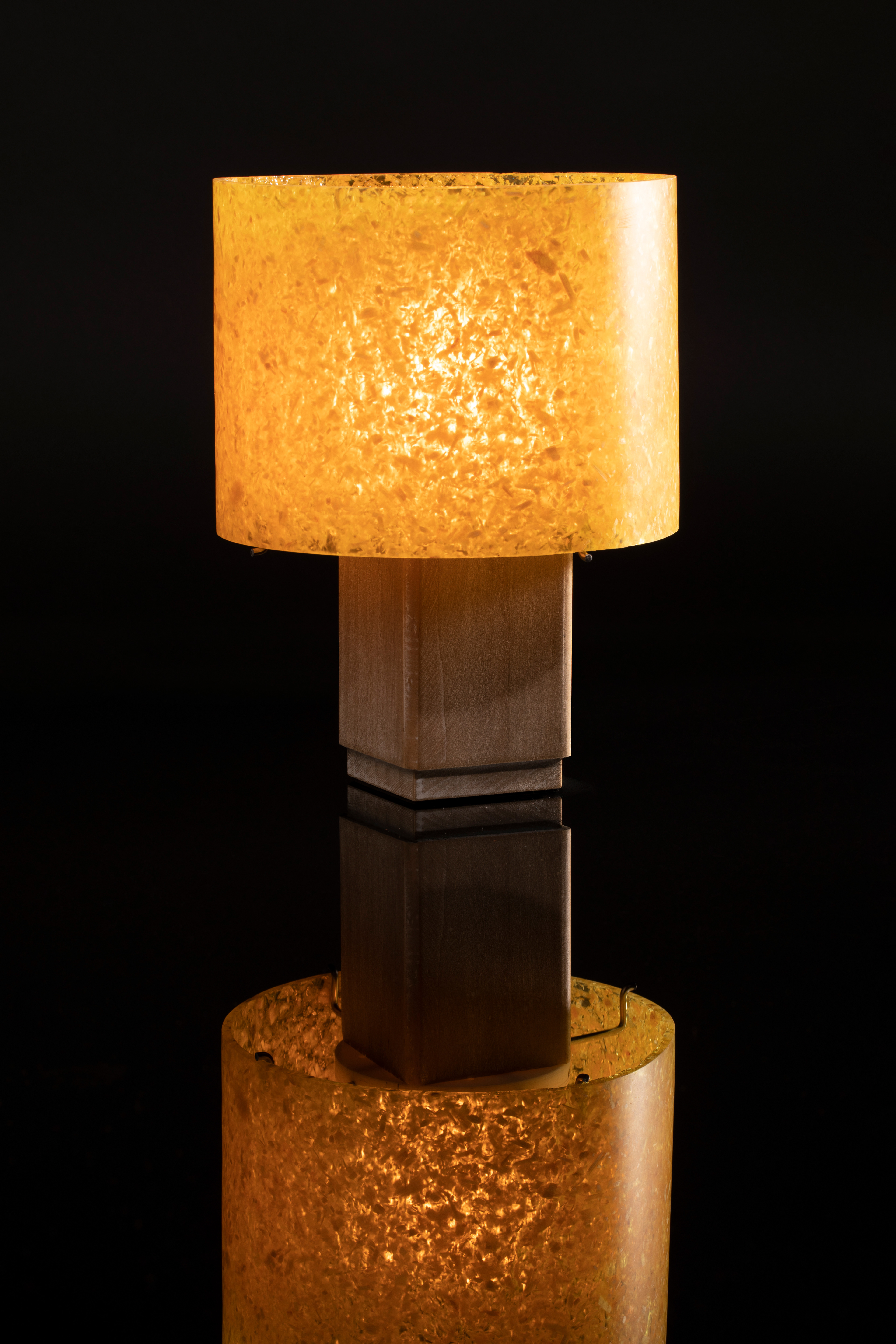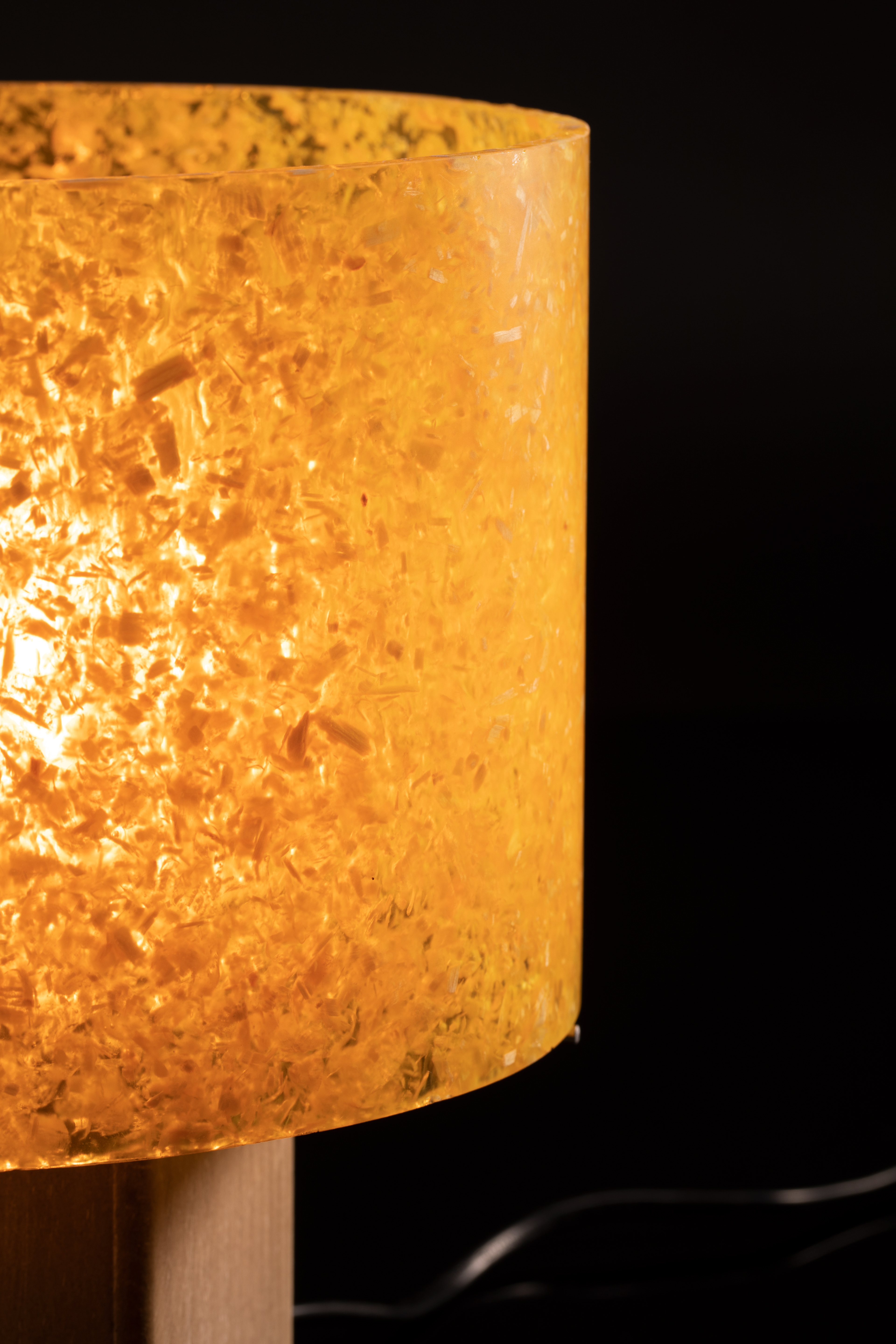 This project was about mastering plastics as a material. The lampshade is made of epoxy. The epoxy contains wood chips and yellow dye. I bent the epoxy during the drying process to create a tube shape.