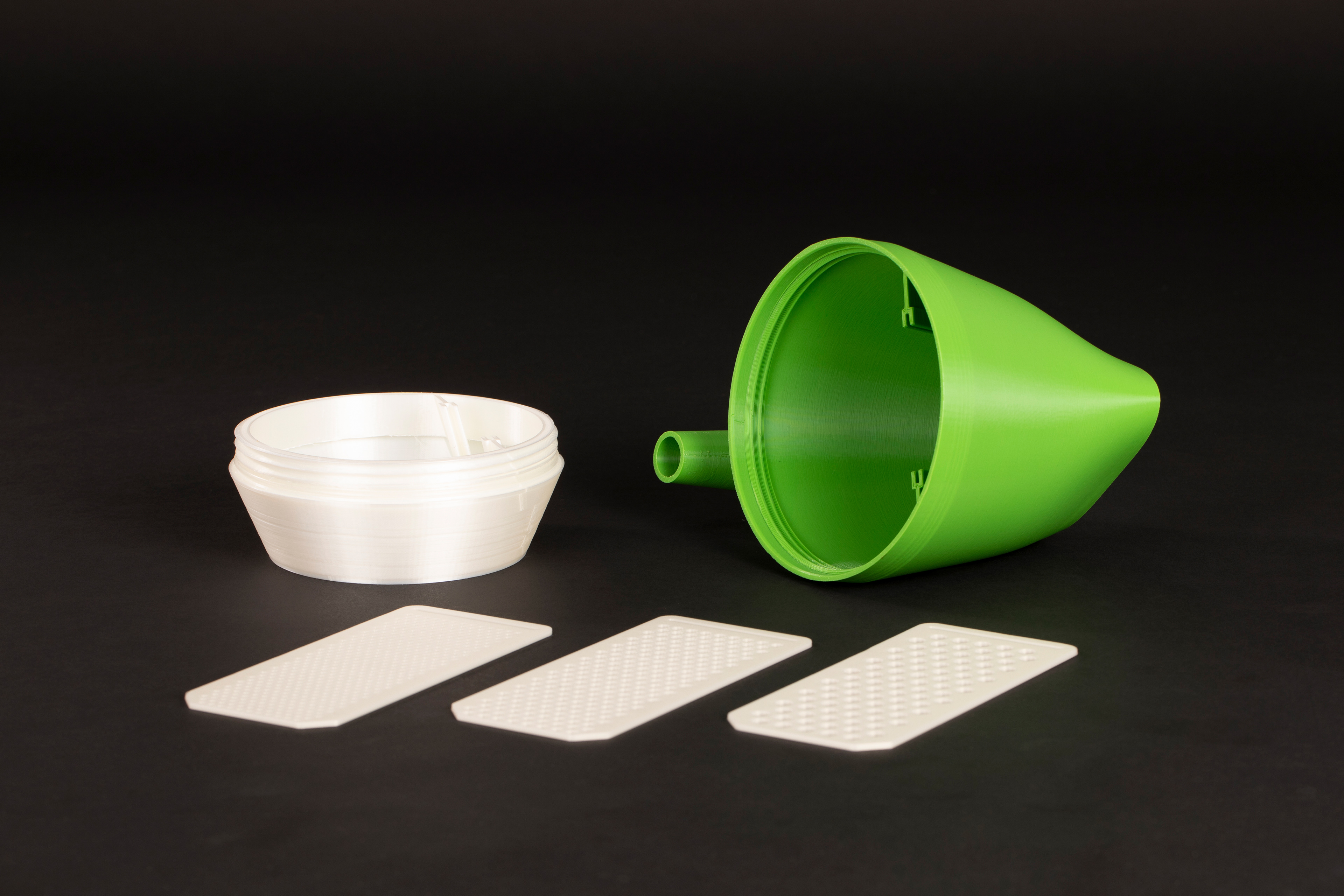 The sieve in the front of the jug is made as big as possible to prevent blockages. The sieve is placed at a 15° angle to prevent solid parts of the soup from falling out of the jug when pouring. The plastic part on top of the sieve makes it clear on what side you’re supposed to pour soup in. The sieve can simply be removed through the top of the jug to use it as a normal jar or to swap the sieve for a sieve with different-sized holes. The top and bottom of the jar can be unscrewed for easy cleaning. I installed a silicone ring in the bottom half of the jar, this ring will prevent leaks.